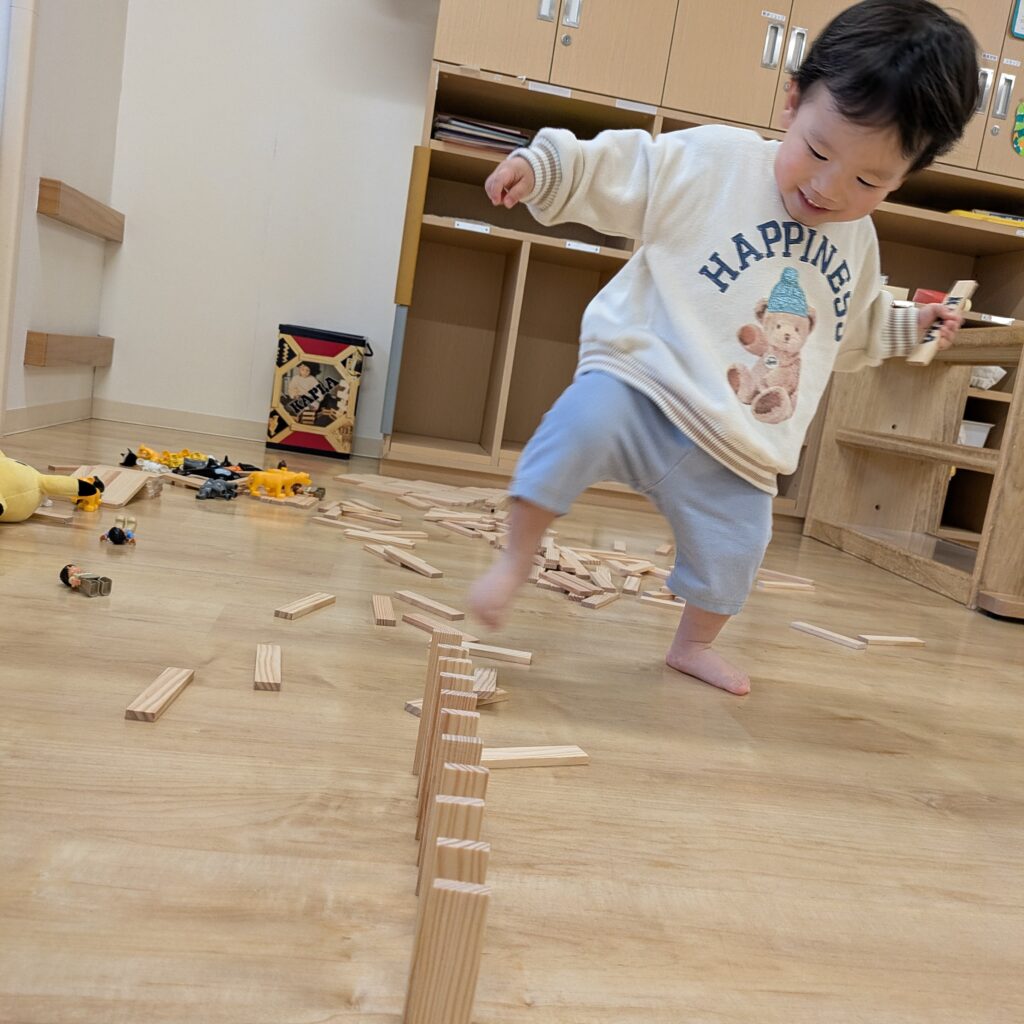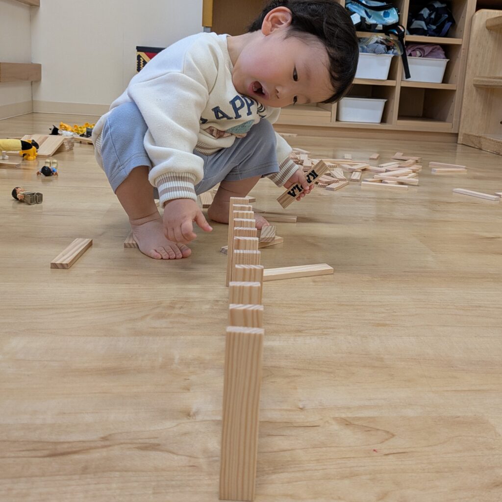 そして、久しぶりにカプラを出してみると、この日は2歳児よりも1歳児の子どもたちが「やってみる!」と、盛んに意欲を示してくれました😳